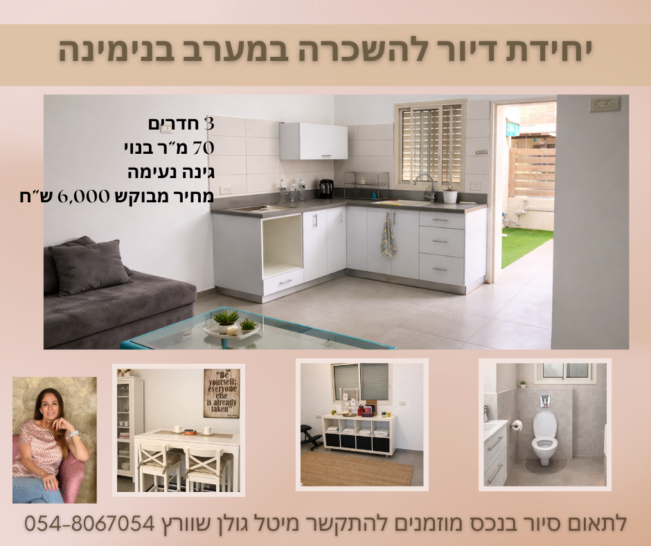 להשכרה בבנימינה, יחידת דיור 3 חדרים כ־70 מ״ר, חד־מפלסית ונעימה, כולל ממ״ד ויציאה לחצר נעימה!