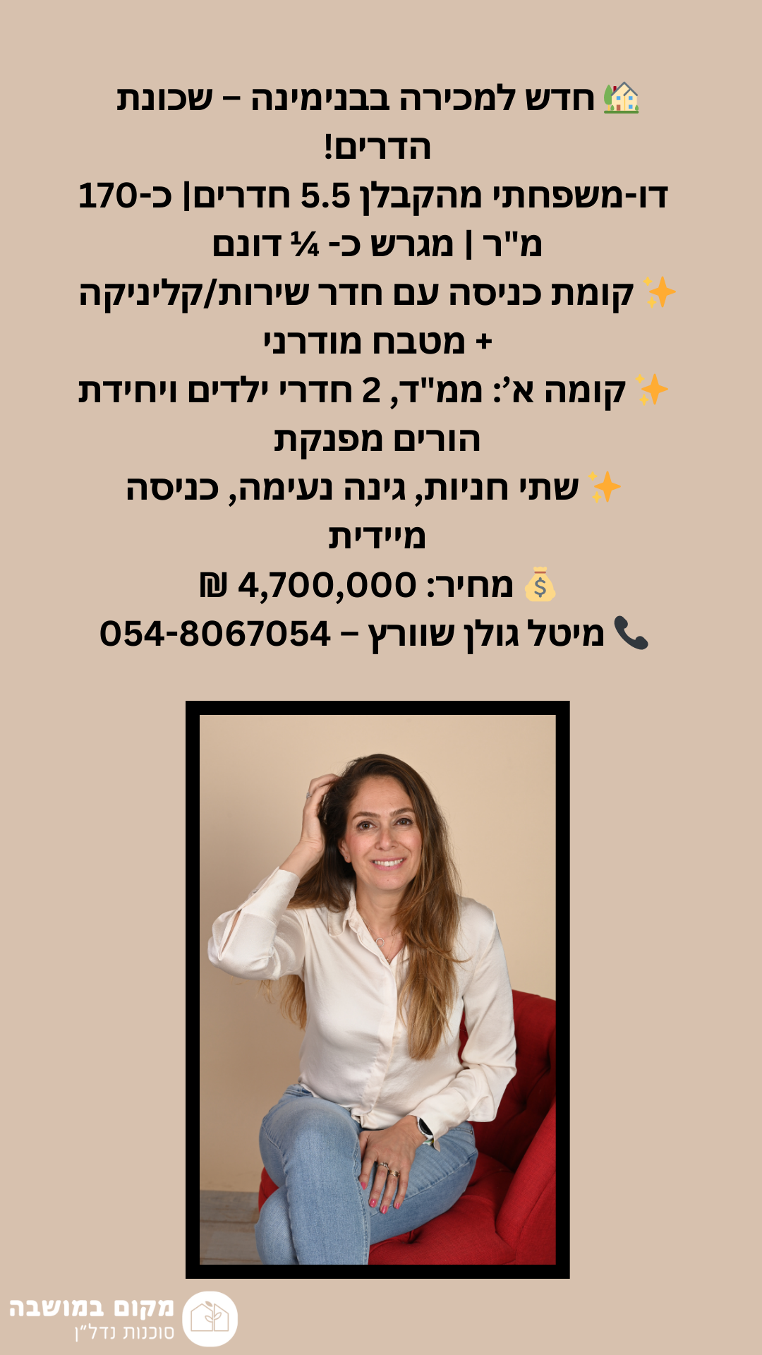 למכירה בשכונת הדרים המבוקשת במערב בנימינה – מיקום מושלם: בקרבת תחנת הרכבת, מרכז מסחרי, יציאה נוחה לכביש 4, תנועת הצופים, בתי ספר וגני מועצה.